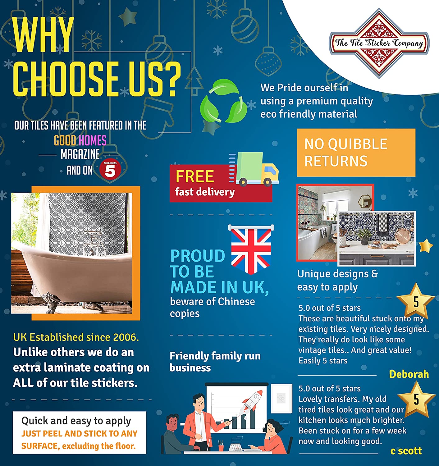 BUILD TO LAST DECADES – Made from 100% quality vinyl, these stickers are scratch-proof as well as washable. They are water-resistant and can be wiped down with a damp cloth making them ideal for use in a kitchen or bathroom.